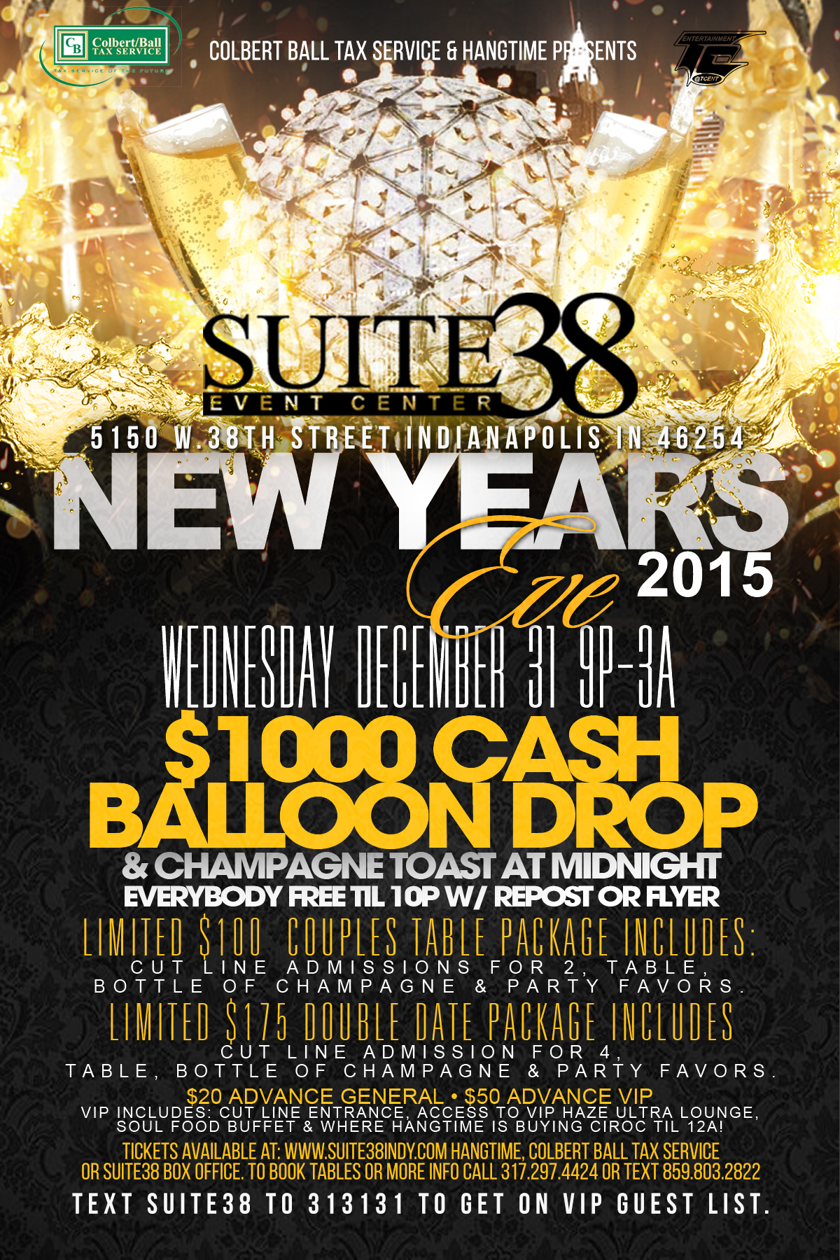 Join Hot 96.3 for the biggest and best New Years Eve party in the city. Colbert Ball Tax Service & Hangtime presents New Years Eve 2015 at Suite 38 Wednesday DECEMBER 31 9pm-3am. Advance tickets available http://www.suite38indy.com, Hangtime, Colbert Ball Tax Service or Suite38 Box Office. To get on the exclusive VIP list Guest List text SUITE38 to 313131.